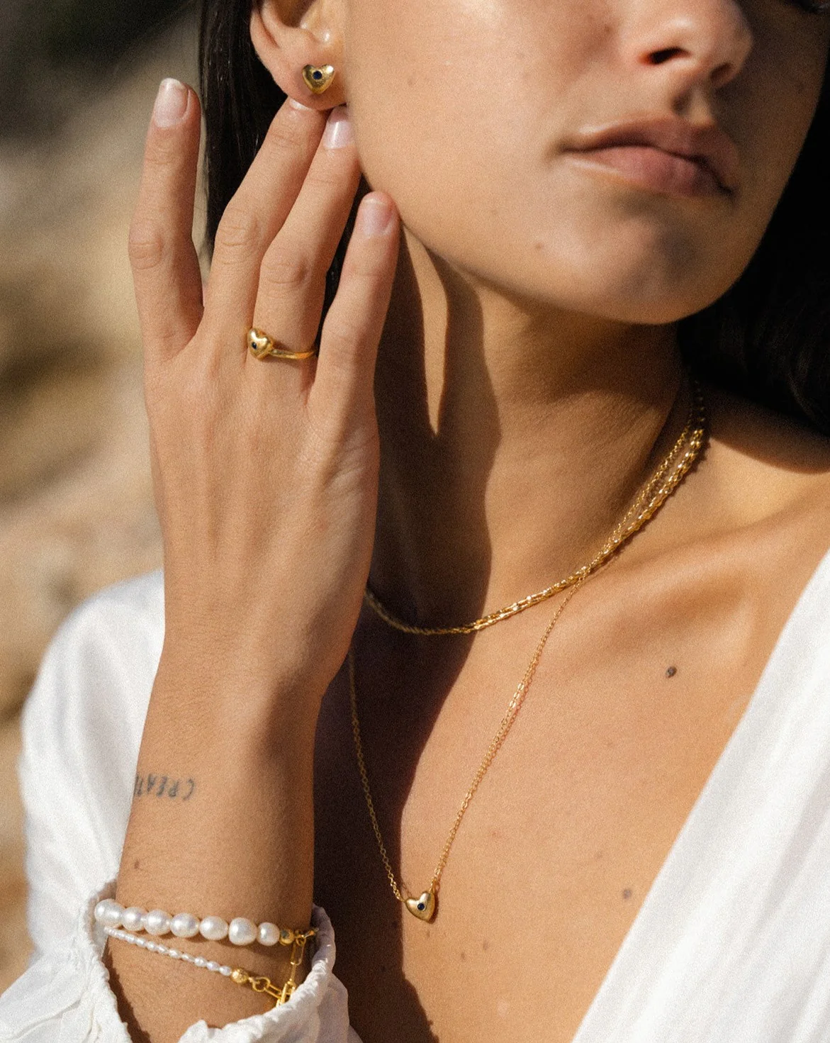 Finish matters too: high polish maximises glow and photographability; brushed/satin reads modern-minimal. The Marina Heart Pendant Necklace leans polished for a clean, luminous effect that plays well with both cool and warm tones.