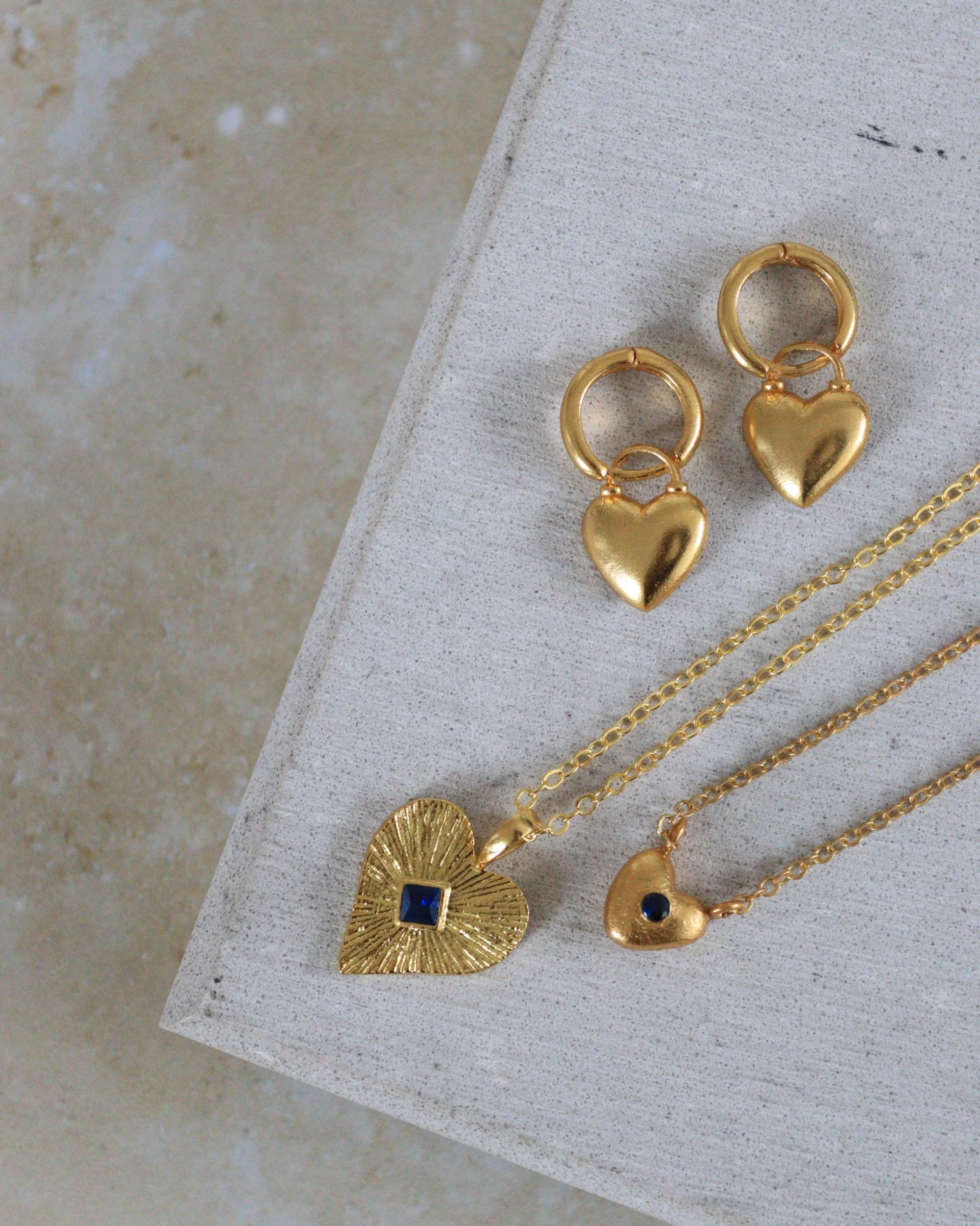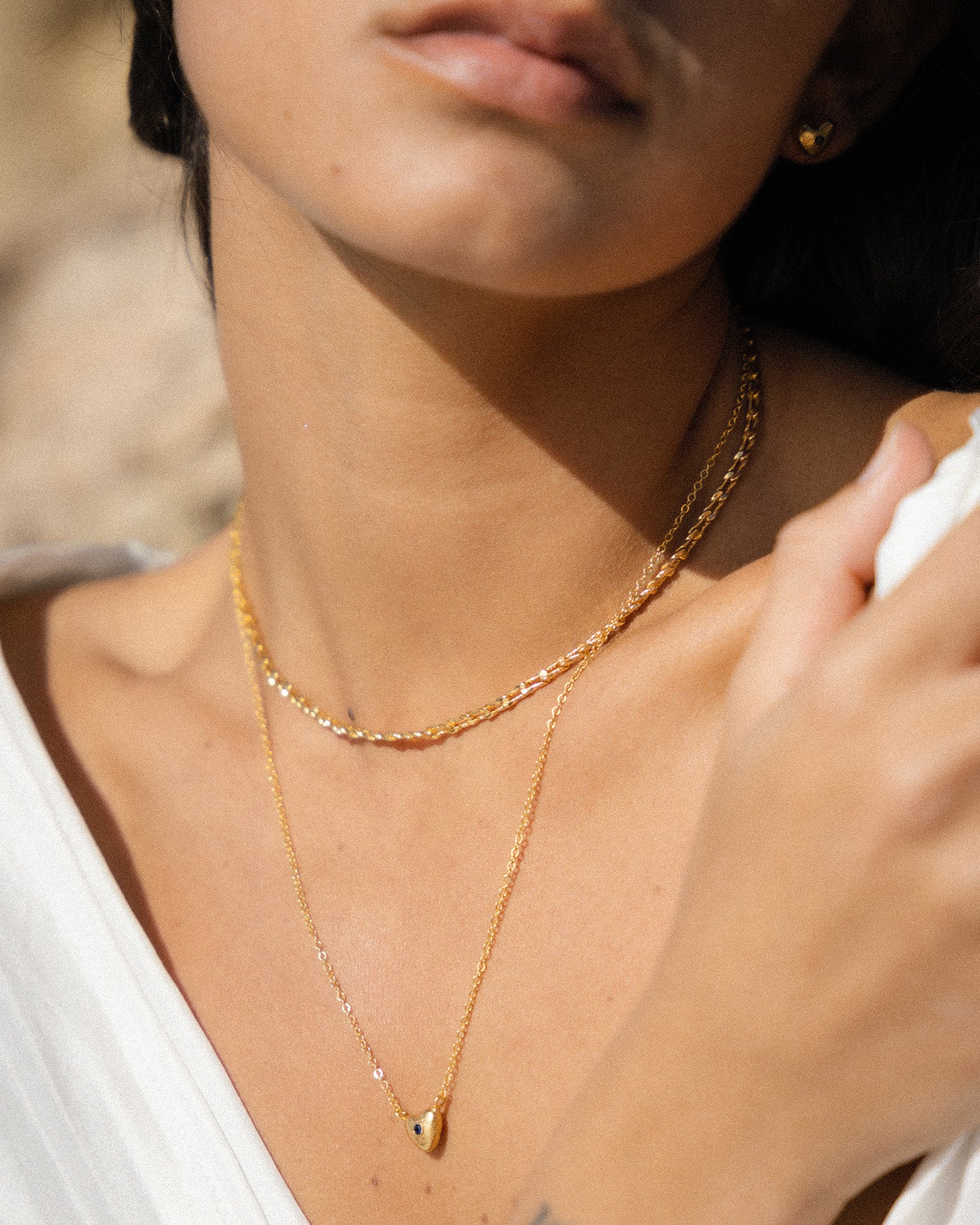 If you plan to layer, aim for a ~2″ gap between each necklace. For example: a bare 14″–15″ cable chain up top, the Marina Heart Pendant Necklace at 17″–18″, and a 20″ chain with a slim bar or teardrop below. The heart should remain the focal point—centered, not crowded.