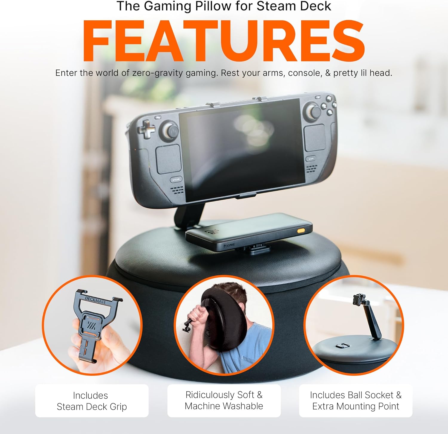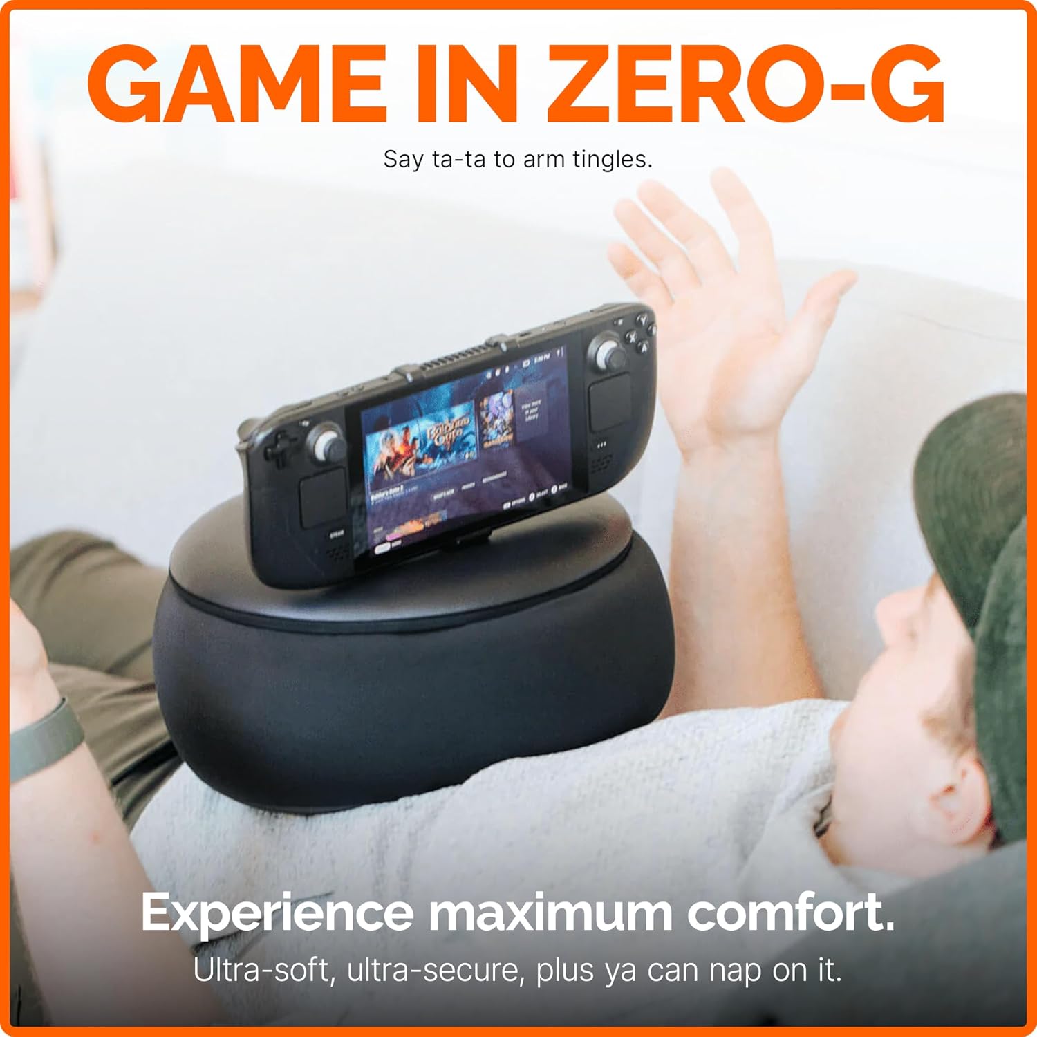 Engineered with a custom grip for the Steam Deck and designed with soft, lightweight, and supportive materials, this pillow accessory provides a “zero-gravity” experience, making it feel like your console is floating in place. With machine-washable Lycra fabric, flexible mounting, and 360° adjustability, it’s more than just a pillow — it’s a complete comfort upgrade for serious gamers.
