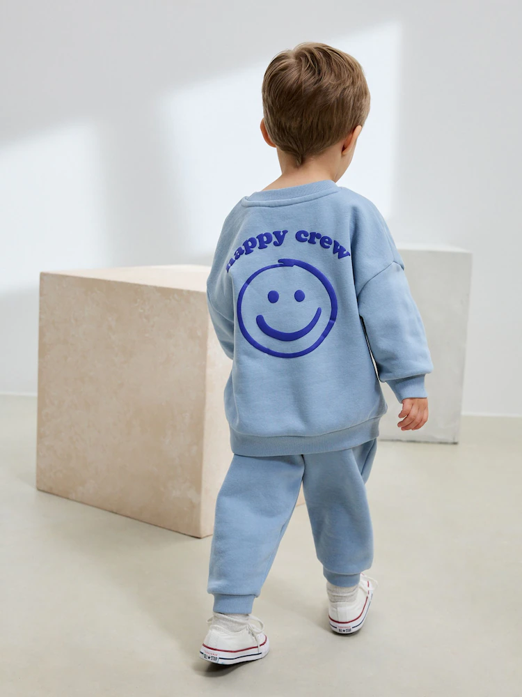 Layer a collared shirt under the crew, swap in chinos, and add clean low-tops or leather shoes. Keep the palette in the light-blue family for cohesion. - Is this set suitable for hand-me-downs?