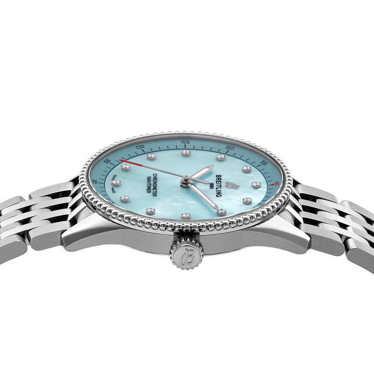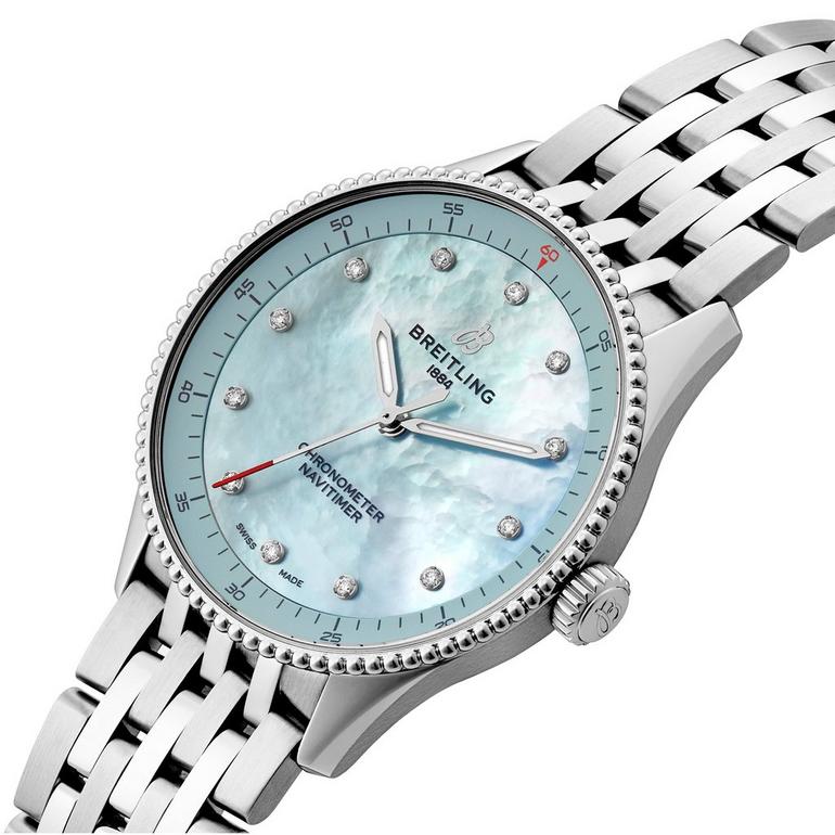A mother-of-pearl (MOP) dial isn’t just “white with a sheen.” It’s a living surface that plays with light—opal pink one moment, silver-blue the next. That chameleon quality means the dial pairs with silver, steel, or white gold jewellery effortlessly, and still flatters yellow or rose metals because MOP reflects warmth. Under daylight, it reads fresh and luminous; under evening bulbs, it turns soft and elegant. On the Breitling Navitimer 32mm Mother of Pearl Ladies Watch, this dial choice elevates simplicity—minimal distractions, maximal glow.
