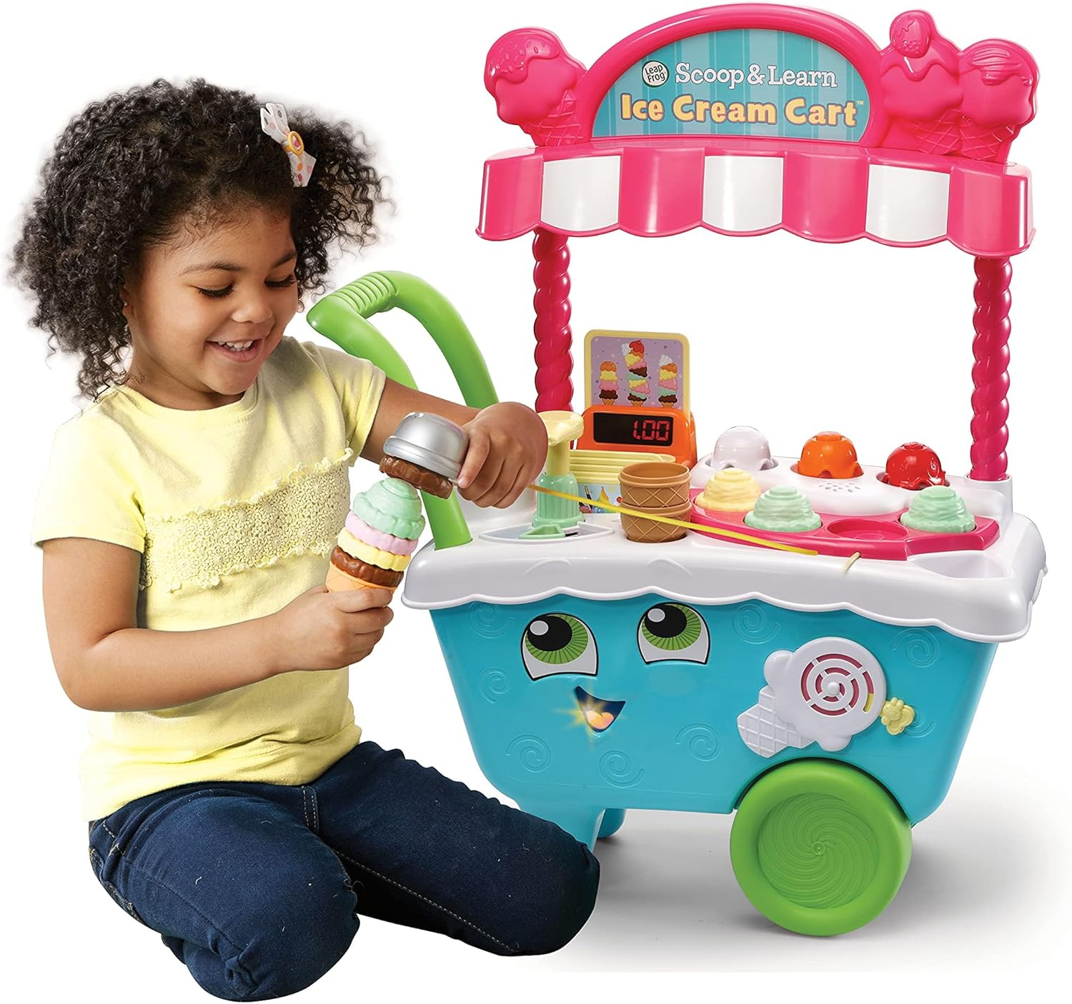 The LeapFrog Scoop & Learn Ice Cream Cart gives a concrete base—scoops and cones—as manipulatives you can count, compare, and pattern with.
