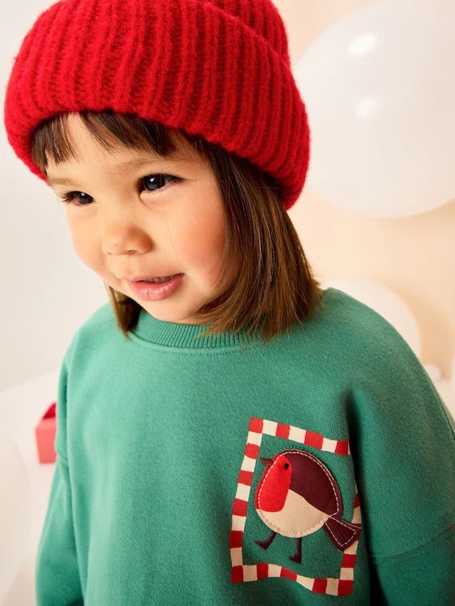 - Mid (style + warmth): The Green Christmas Robin Crew Neck Sweatshirt (3mths–7yrs) adds festive personality and light insulation.