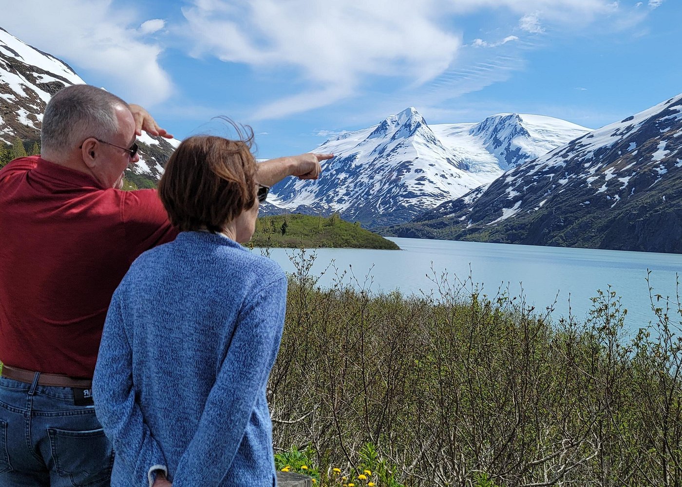 South of Portage, the road enters a valley ringed by ice: Explorer, Byron, Portage, and other hanging glaciers spill from the Kenai Mountains. You’ll visit scenic ponds and short trails that showcase glacial runoff in hues of teal and steel blue. When seasonal conditions allow, the group may walk portions of the Trail of Blue Ice through America’s northernmost temperate rainforest—spruce, hemlock, and muskeg underfoot.